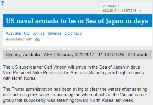 【环球网综合报道】朝鲜半岛局势紧张之际,美国副总统彭斯22在澳大利亚表示,美军卡尔文森号航空母舰战斗群将在数日内抵达日本海。