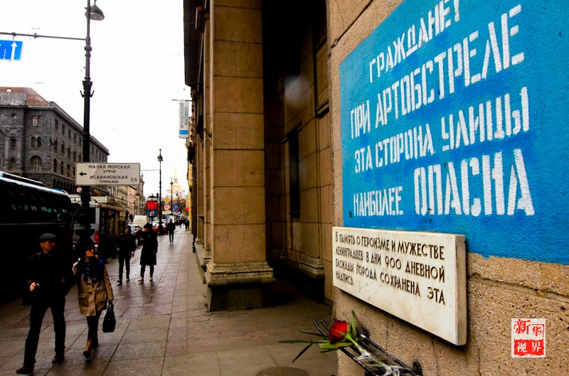 ↑俄罗斯圣彼得堡涅瓦大街的历史遗址提示语。下面的标语意为:“为了纪念列宁格勒900天围困中人们的英雄气概和勇气”(2015年4月16日摄)。