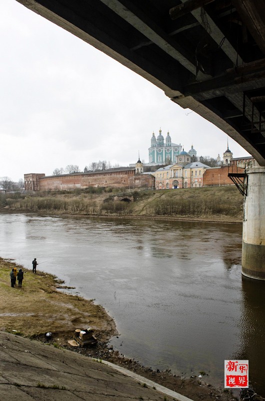 ↑俄罗斯斯摩棱斯克的圣母升天大教堂与第聂伯河(2015年4月21日摄)。