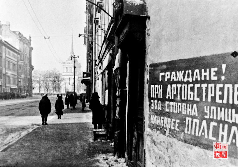 ↑苏联列宁格勒涅瓦大街一角,墙上写着“市民们!此处街道易受炮击”的提示语(1942年12月10日摄)。