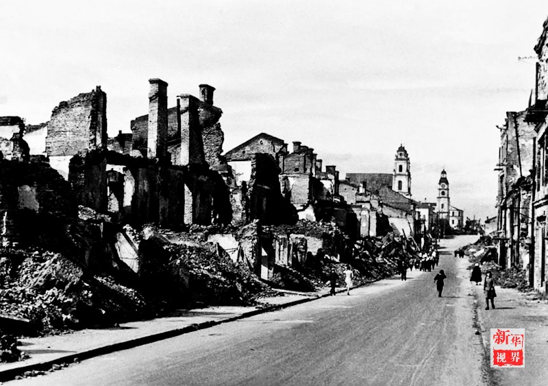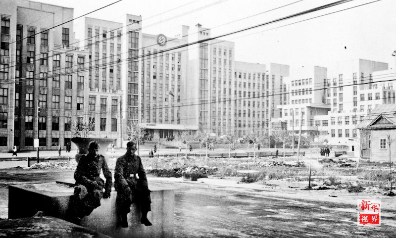 ↑卫国战争时期在德国法西斯占领下的明斯克,政府大楼上悬挂着纳粹的标志。