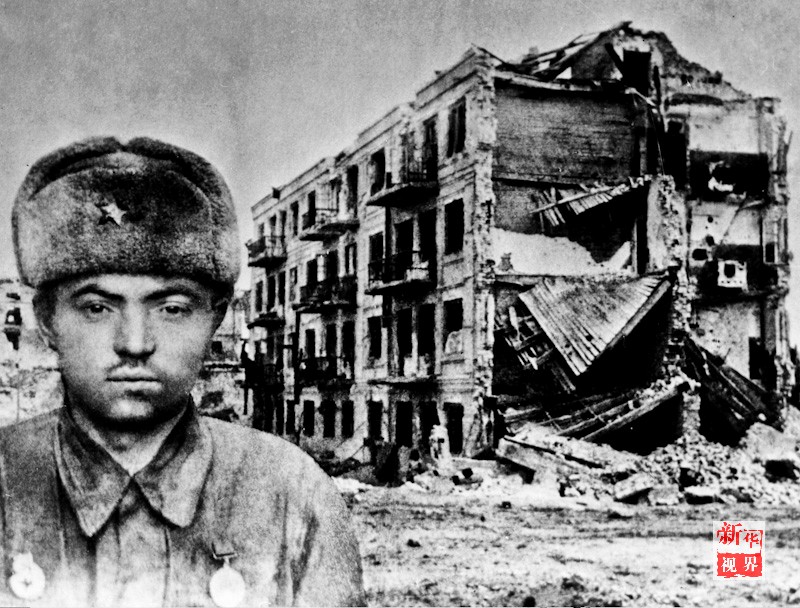 ↑在斯大林格勒拍摄的士兵巴甫洛夫与巴甫洛夫大楼的合成资料照片。巴甫洛夫曾带领20多人在大楼与数倍于己的德军浴血奋战,最终获得了胜利。大楼因此被命名为巴甫洛夫大楼。
